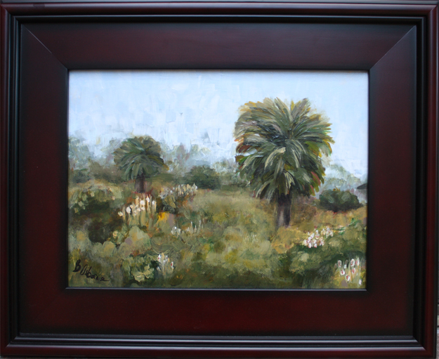 This painting is inspired by the my surroundings. Lush prairies with palms, grasses and wildflowers.
