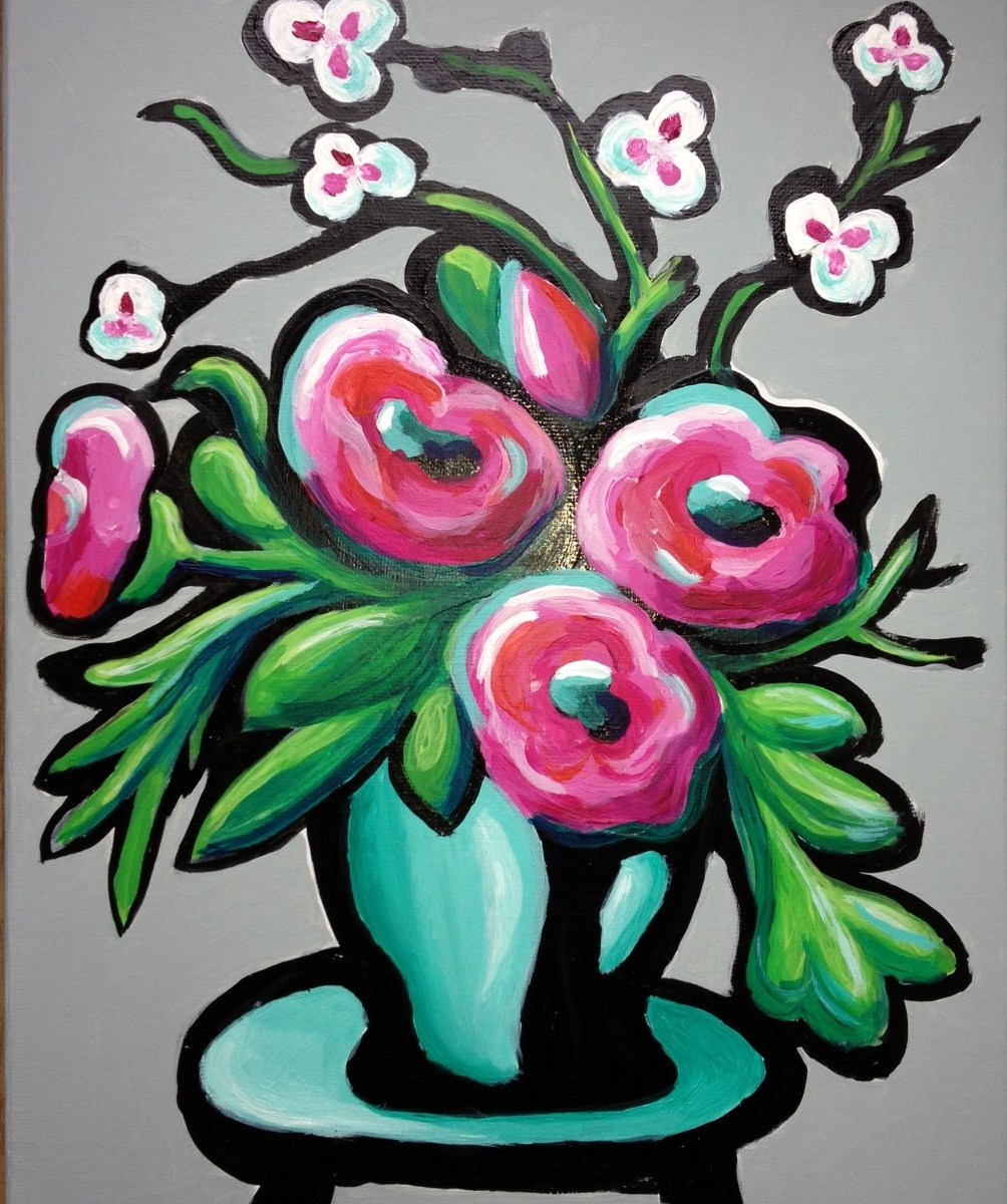 My pink peonies. This was one of my first painting. It took me forever. I learned how to paint the background one solid color with no canvas showing thru. I really...