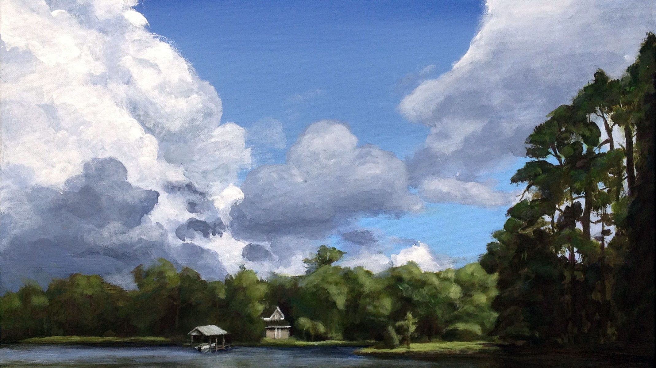 As the title indicates, there's no place like home. This is a painting looking west from our dock. Summer thunderstorm brewing.