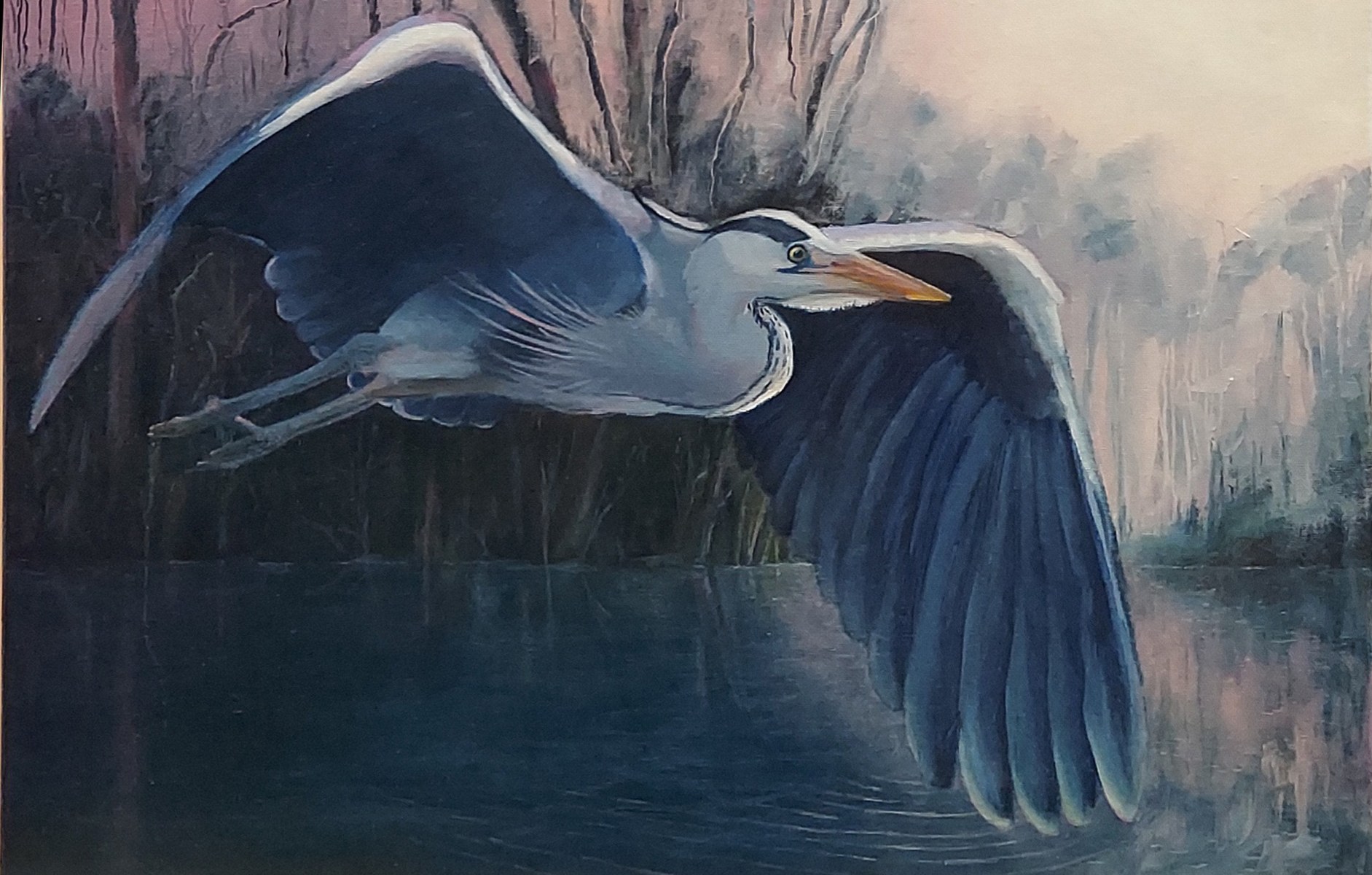 As the sun rises, this great blue heron is heading to breakfast. 16×20, Oil, available